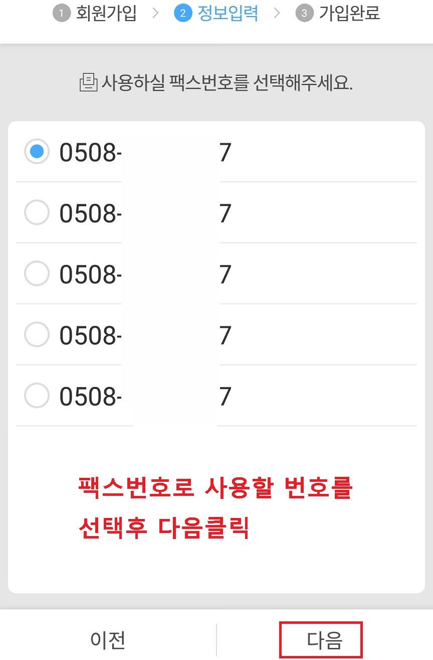 7. 무료 모바일 팩스번호로 사용할 번호를 한 개 선택 후 다음을 클릭한다.