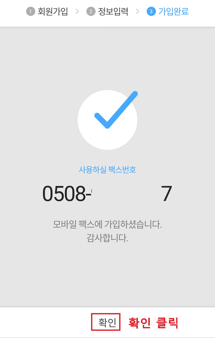 9. 아래 사진과 같은 화면이 보이는데 이제 확인을 누르면 스마트폰 모바일 팩스 설치가 완료된다.
