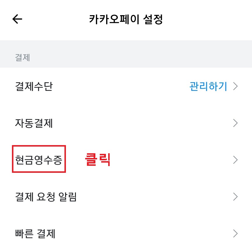 8. 카카오페이 설정 페이지에서 현금영수증을 클릭한다.