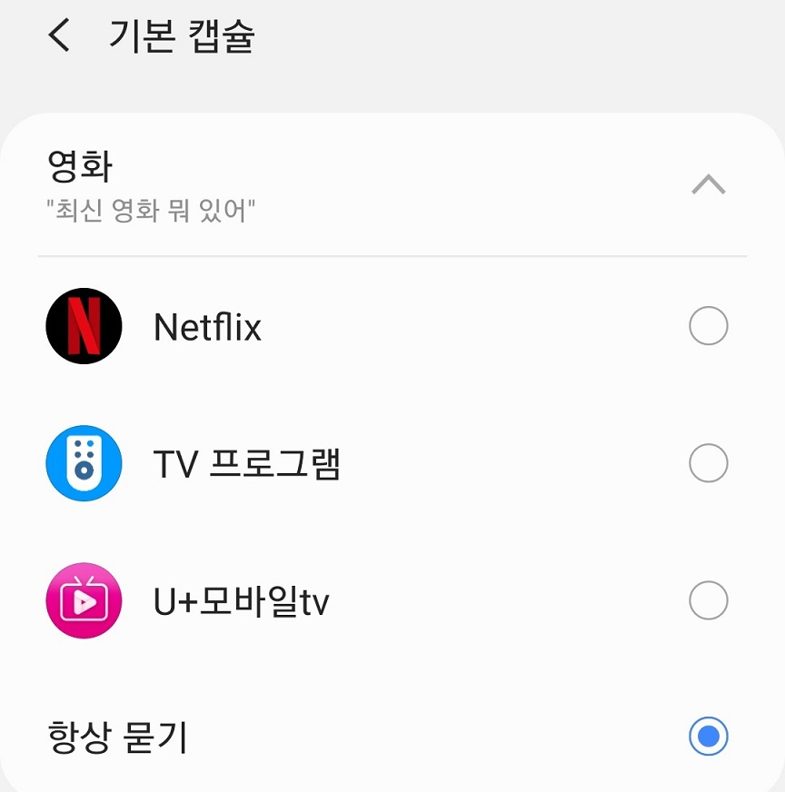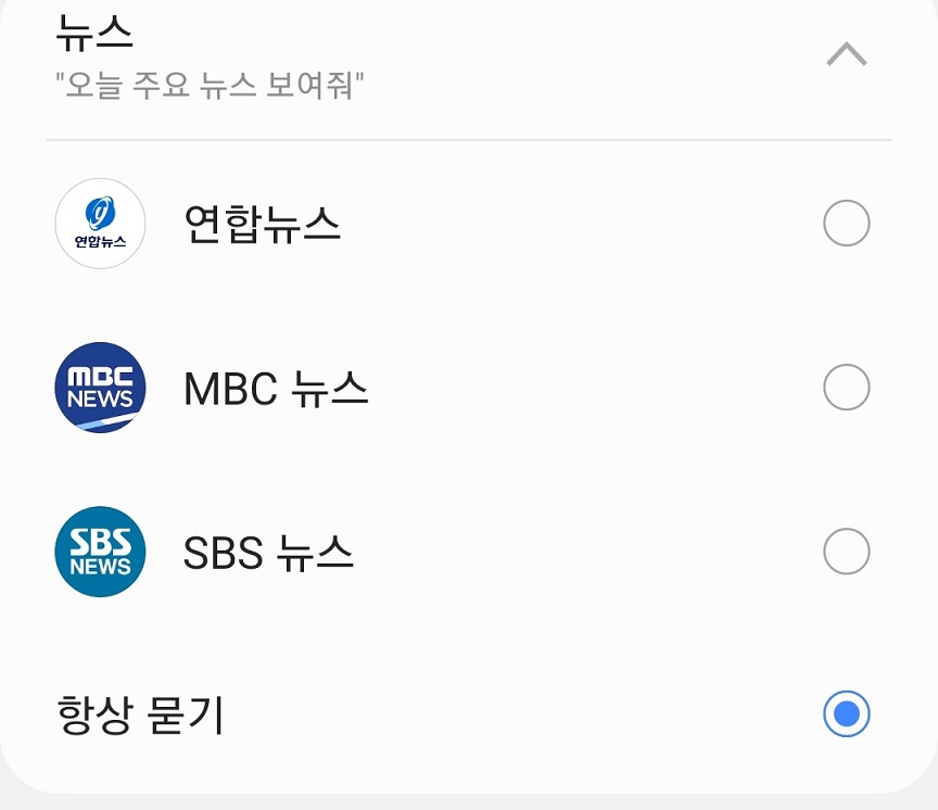 만약 항상 묻기를 선택하면 특정 앱으로 연결되지 않고 항상 선택하도록 빅스비가 묻는다.