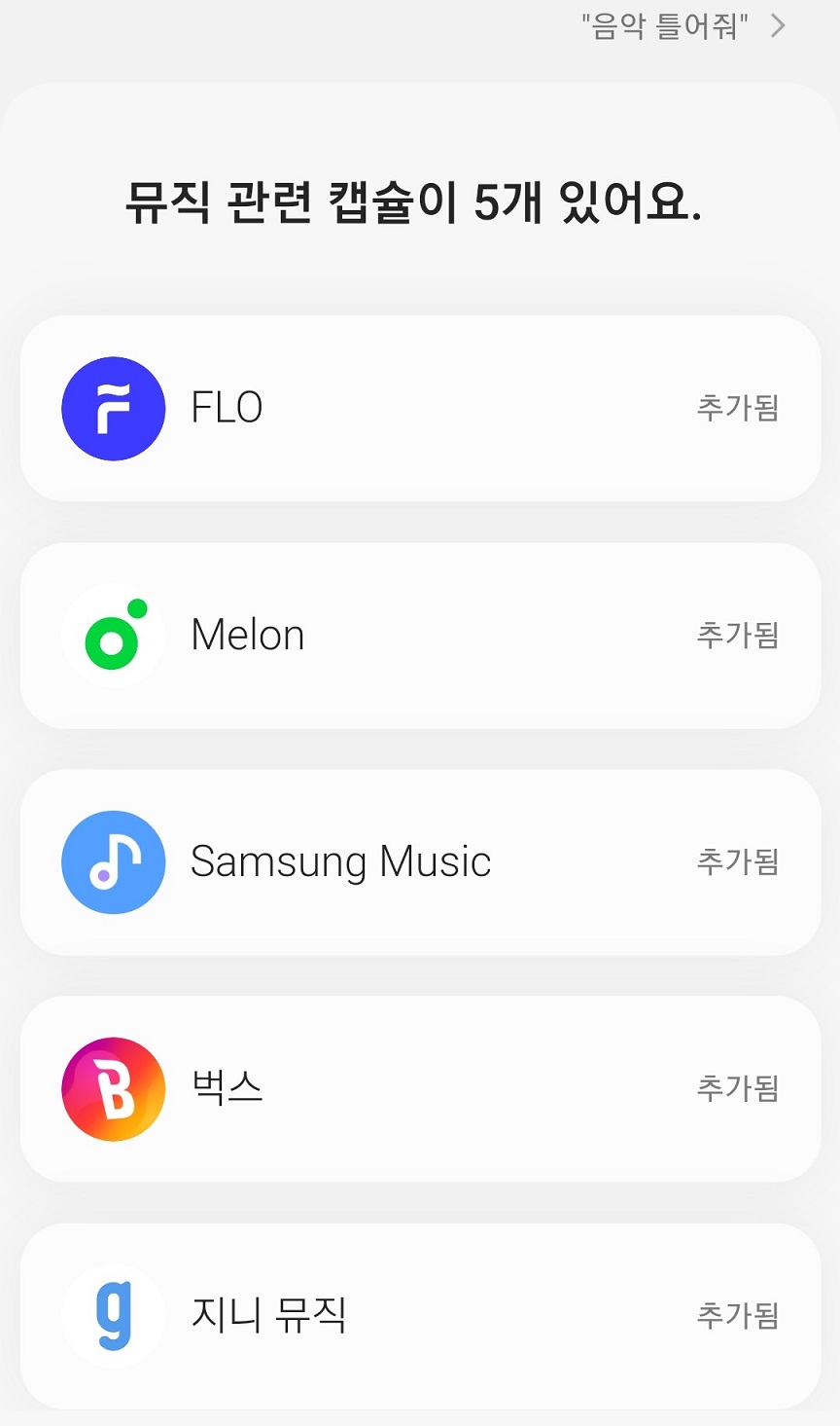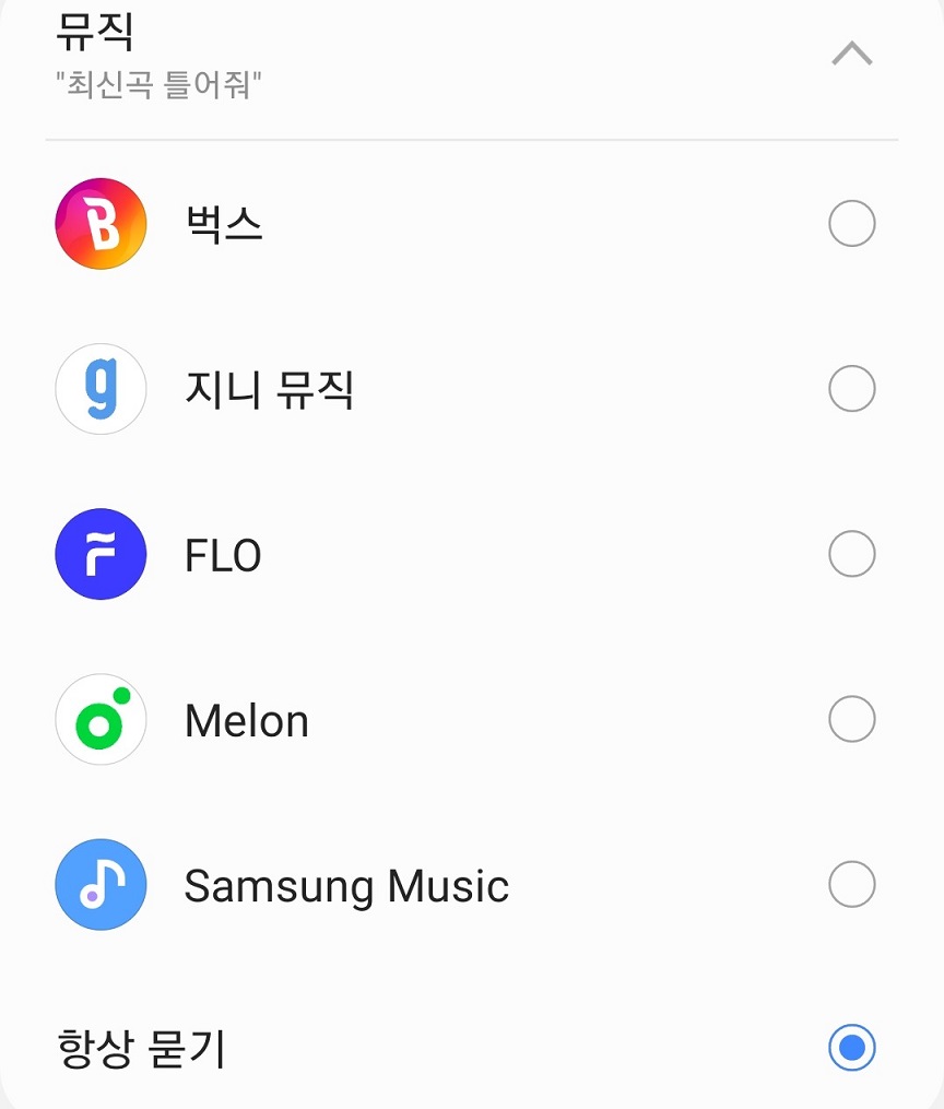 뮤직을 틀어달라고 명령할 때 연결될 앱을 고르는 화면이다.