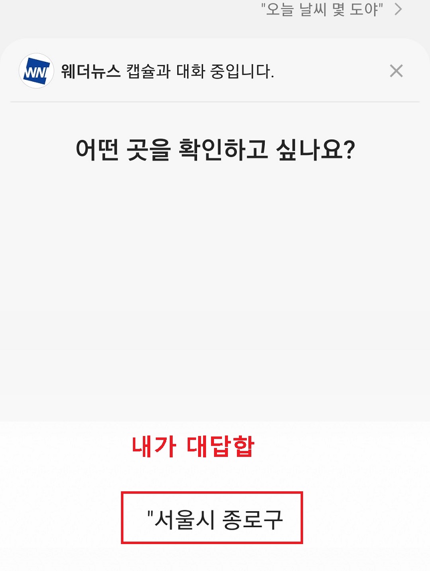 16. 그럼 빅스비가 어떤 곳의 날씨를 확인하고 싶은지 묻는다.