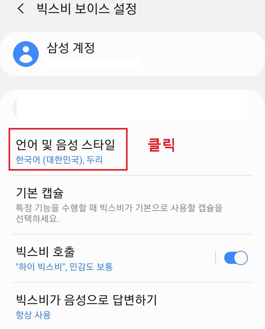 그럼 빅스비 보이스 설정 화면이 나오는데 여기서 언어 및 음성 스타일을 클릭한다.