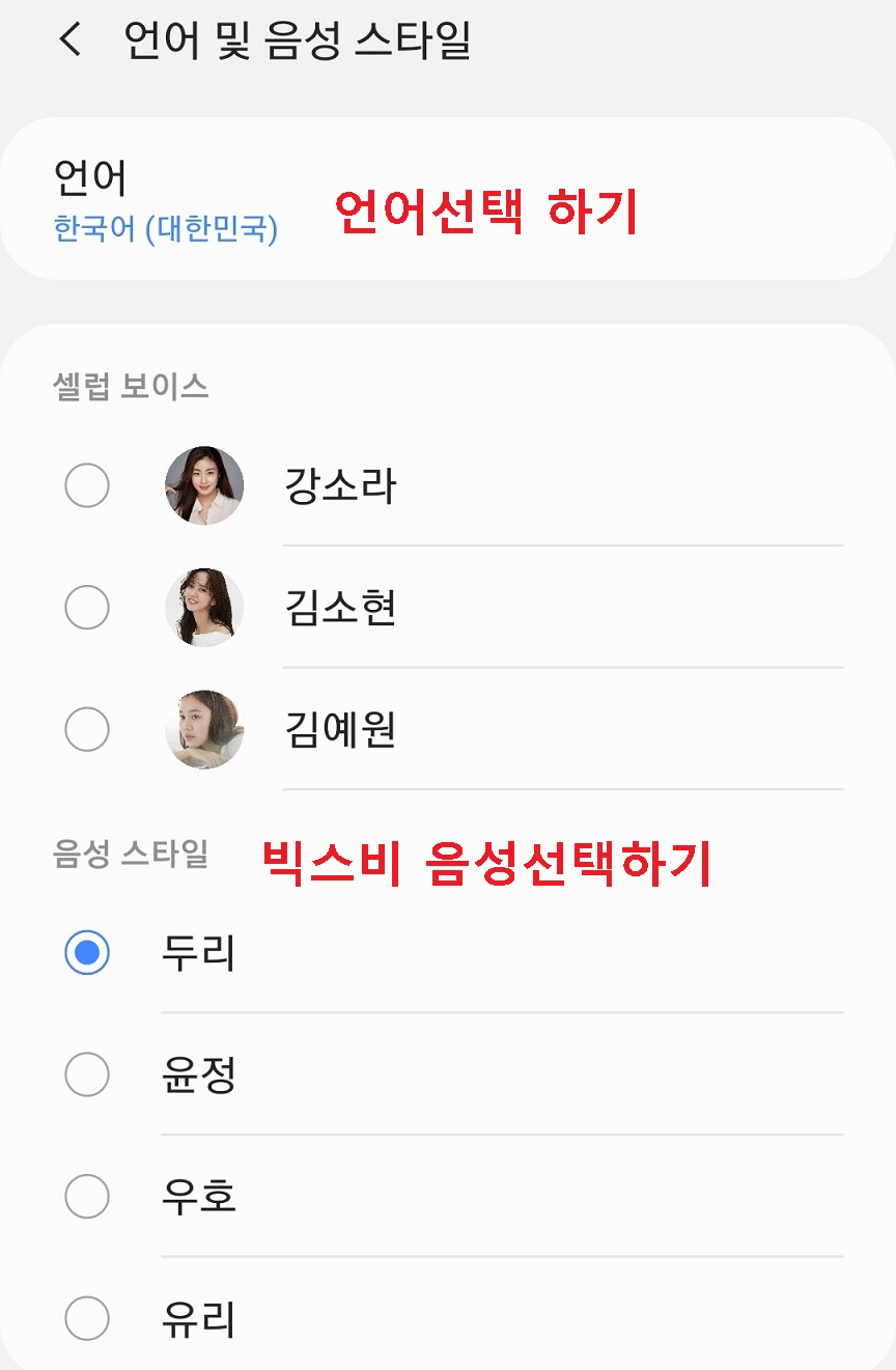 그리고 아래쪽에 빅스비의 음성을 선택한다.