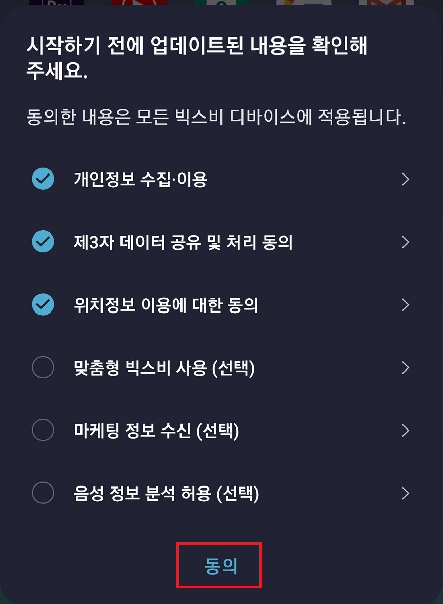 3. 빅스비 업데이트할 내용이 있다면 아래 사진과 같은 화면이 나타나는데 동의하면 된다.