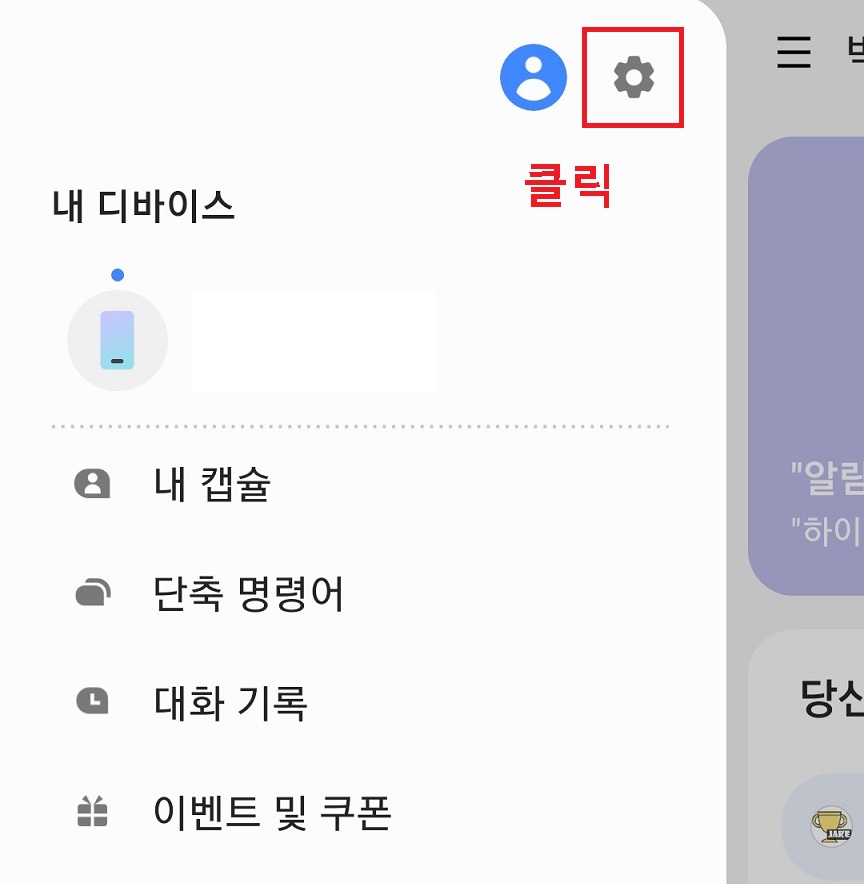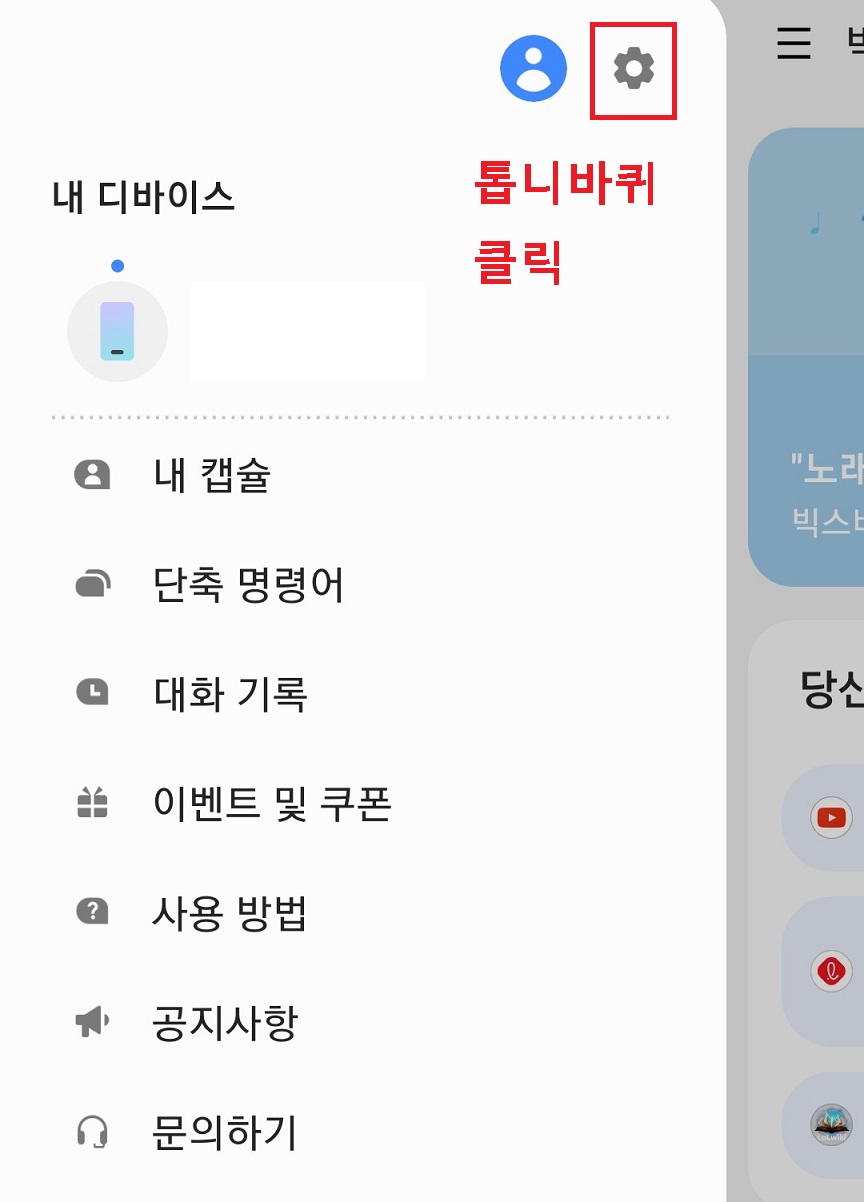 24. 휴대폰의 빅스비 버튼을 눌러서 빅스비 앱을 연후 우측 상단 톱니바퀴를 클릭한다.