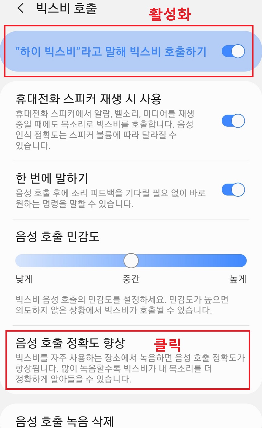 그리고 음성 호출 정확도 향상을 클릭한다.