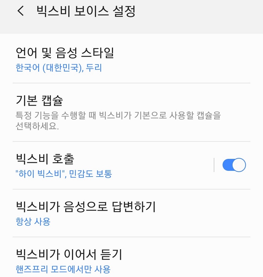빅스비가 자체 음성을 가지고 있는데 이 음성을 선택할 수 있다.