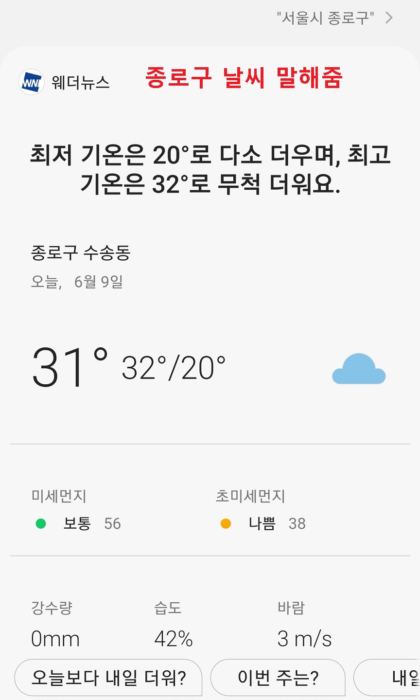 18. 그럼 아래 사진과 같이 종로구의 날씨가 화면으로 나타나고 빅스비의 음성으로 날씨를 말해준다.