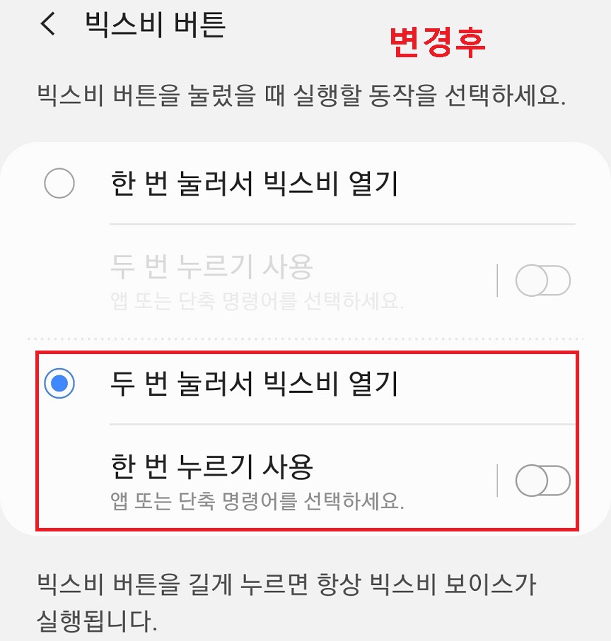 4. 빅스비 버튼 설정에서 한번 눌러서 빅스비 열기를 두 번 눌러서 빅스비 열기로 변경해준다.