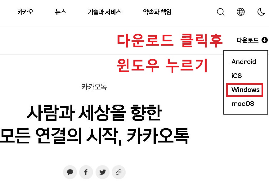 그러면 4가지 중 하나를 선택할 수 있는데 우리는 PC 카카오톡 설치하기를 할 것이므로 Windows를 클릭한다.