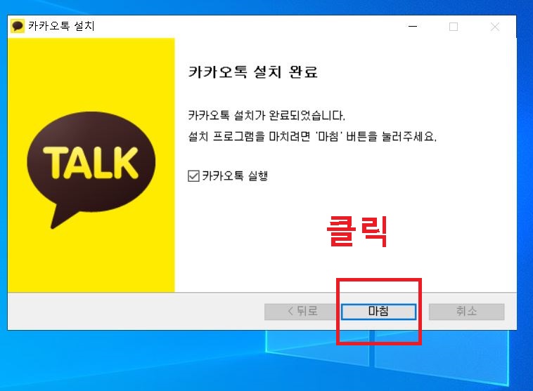 9. 카카오톡 설치 완료라는 대화창이 나타나면 카카오톡 실행에 체크 후 마침을 클릭한다.