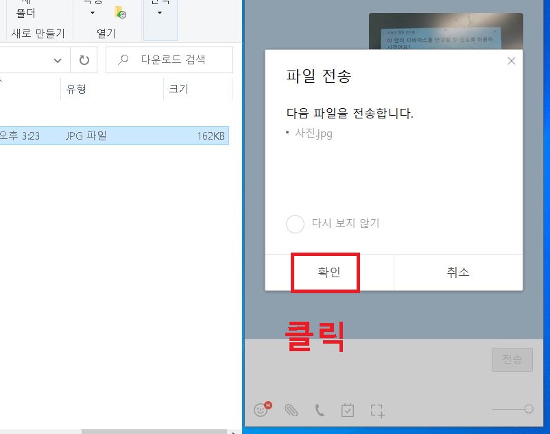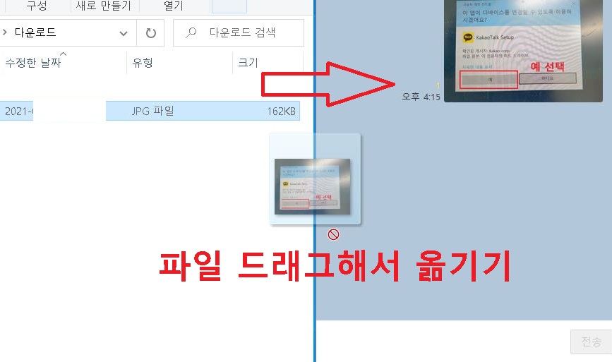 1. PC 폴더에 있는 파일을 채팅방으로 드래그해서 옮긴다.