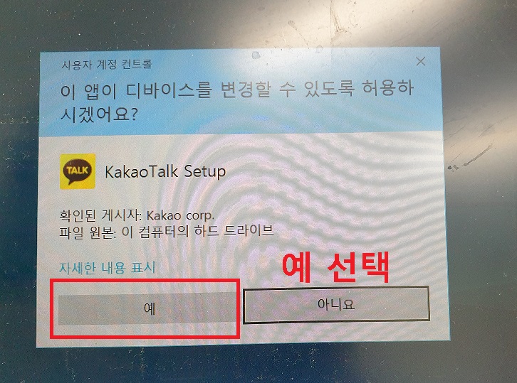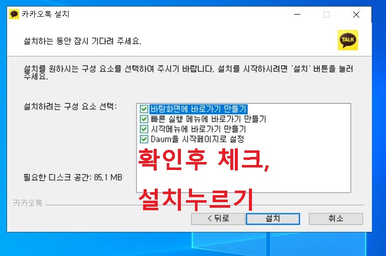 8. 카카오톡 설치하기 대화창에서 설정을 확인 후 설치하기를 누른다.