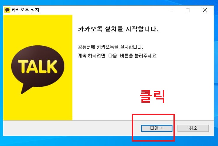 6. 카카오톡 설치를 시작합니다.라는 대화창이 나오면 다음을 클릭해서 진행되게 한다.