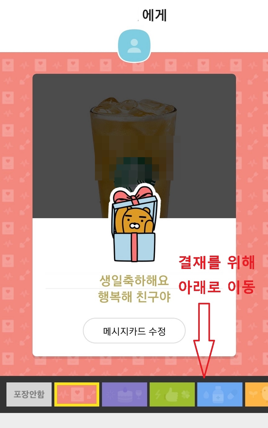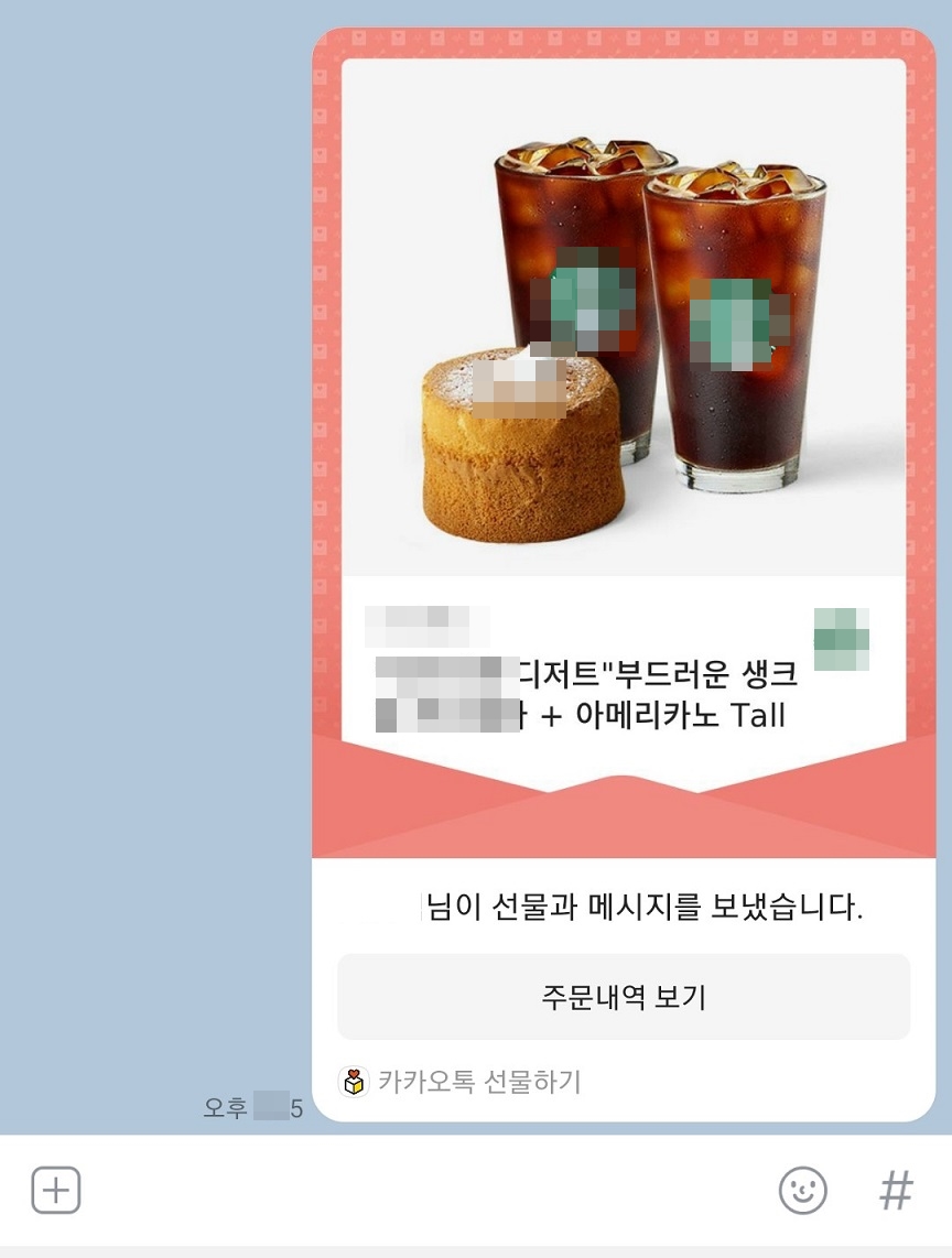 이렇게 하면 카카오톡 선물하기 방법으로 선물 받은 친구에게 선물과 함께 메시지가 전달된다.