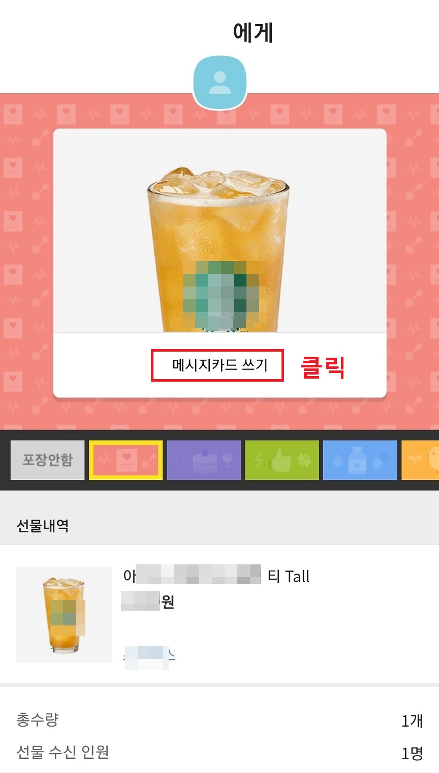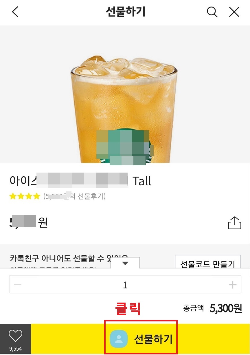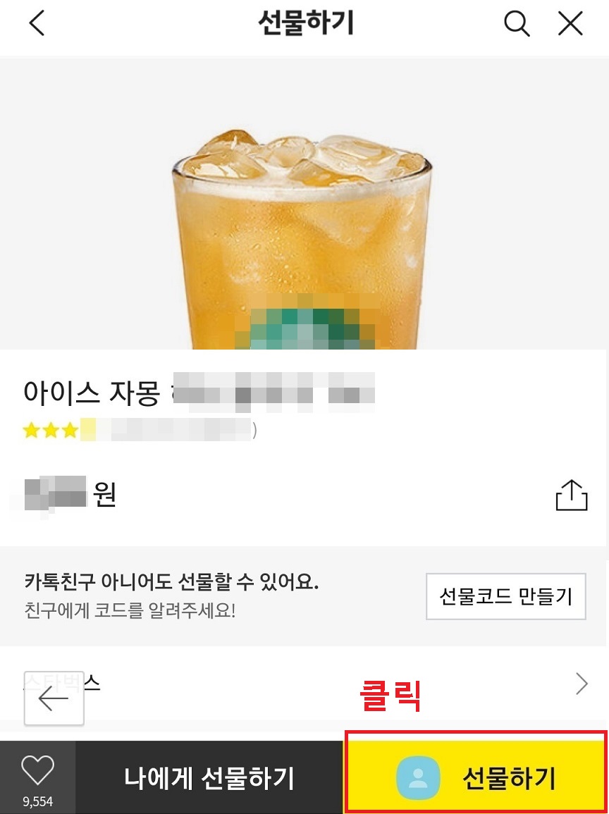 4. 임의로 시원한 차 한잔을 카카오톡 선물하기로 하고 선택해보았다.