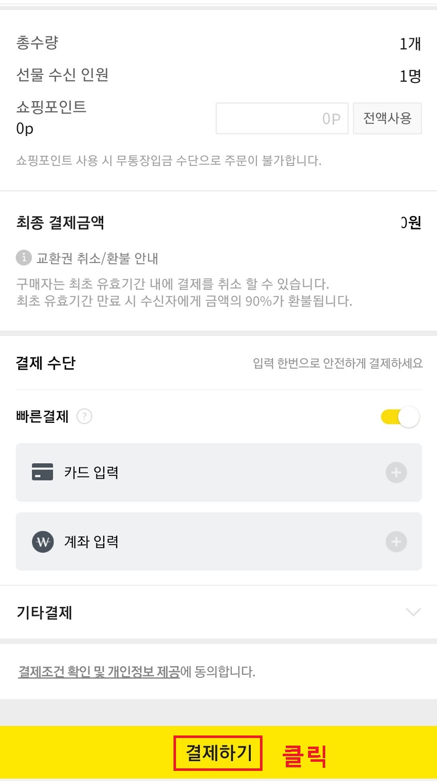 그럼 카카오톡 선물하기 결재를 위해 페이지 아래로 이동한다.