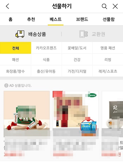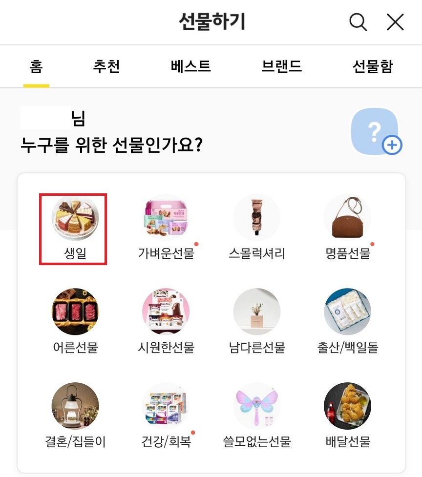화면에 선물 카테고리 목록이 보이는데 자신에게 맞는 카테고리를 선택한다.