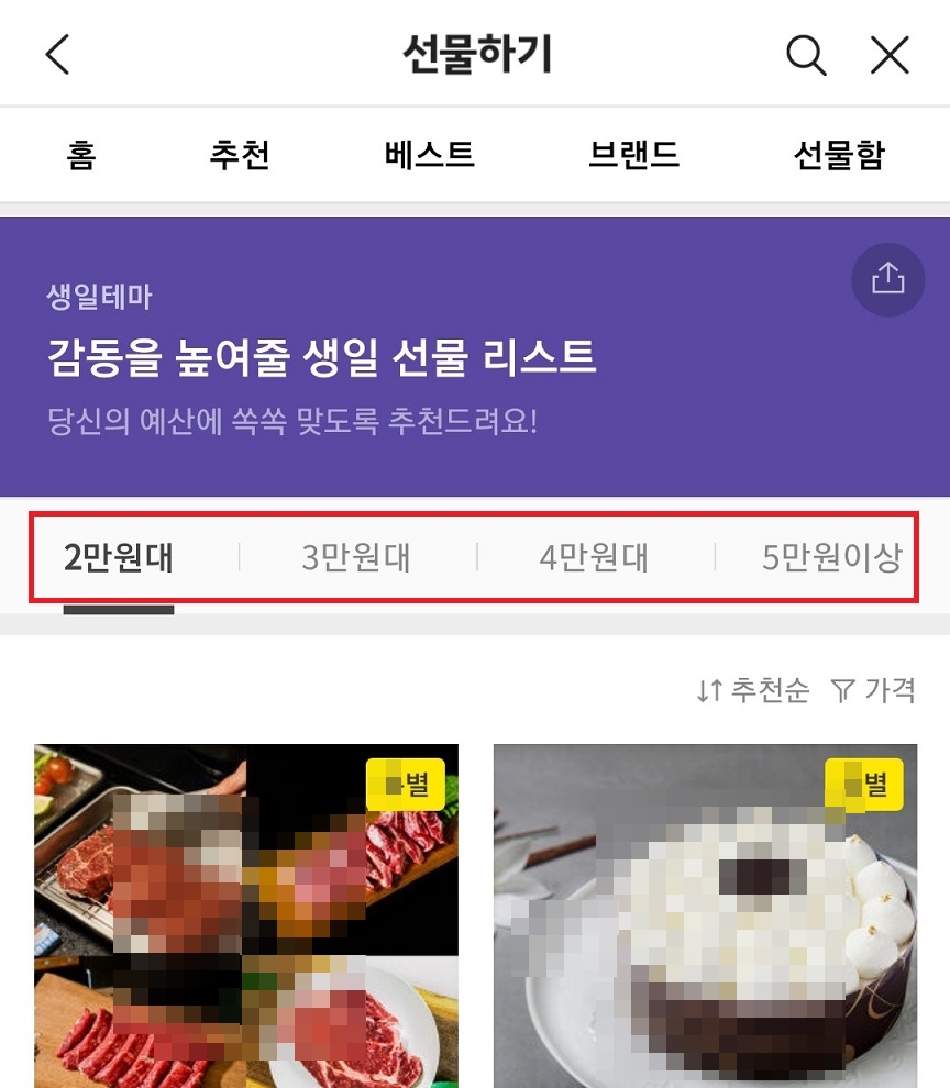 3. 그럼 가격대별로 다양한 생일선물 후보를 고를 수 있다.