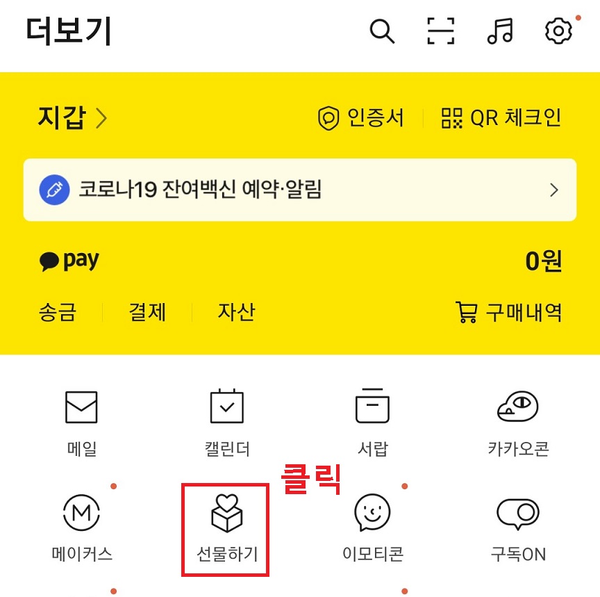 1. 카카오톡 더보기 페이지에서 선물을 클릭한다.(아래 사진 표시 부분)