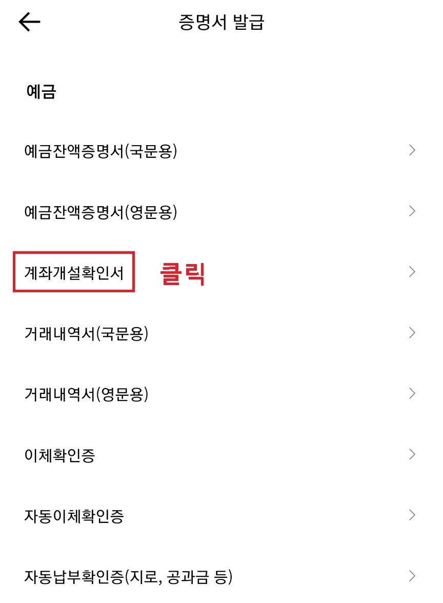 4. 증명서 발급 페이지에서 계좌 개설 확인서를 클릭한다.