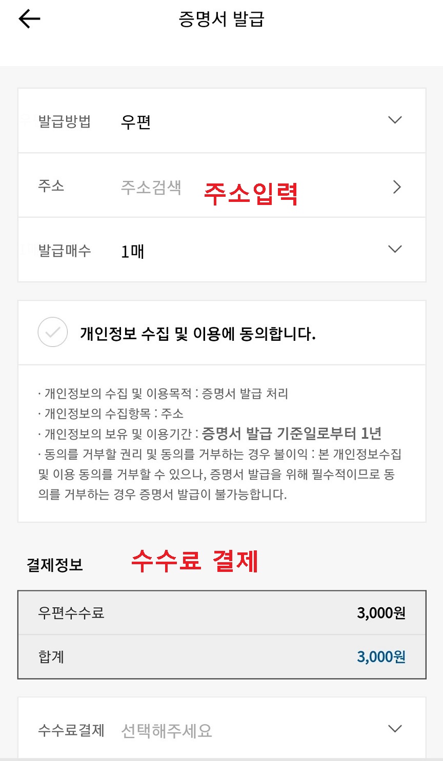 여기서 주소 입력하고 수수료 3,000원 결제 후 다음으로 넘어가면 카카오 뱅크 통장사본 대신 계좌 개설 확인서를 발급받을 수 있다.