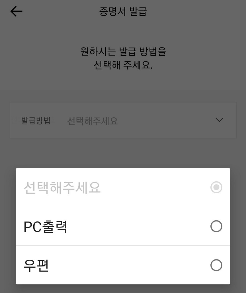 7. 그럼 PC 출력과 우편 둘 중 하나를 선택할 수 있는 화면이 생긴다.