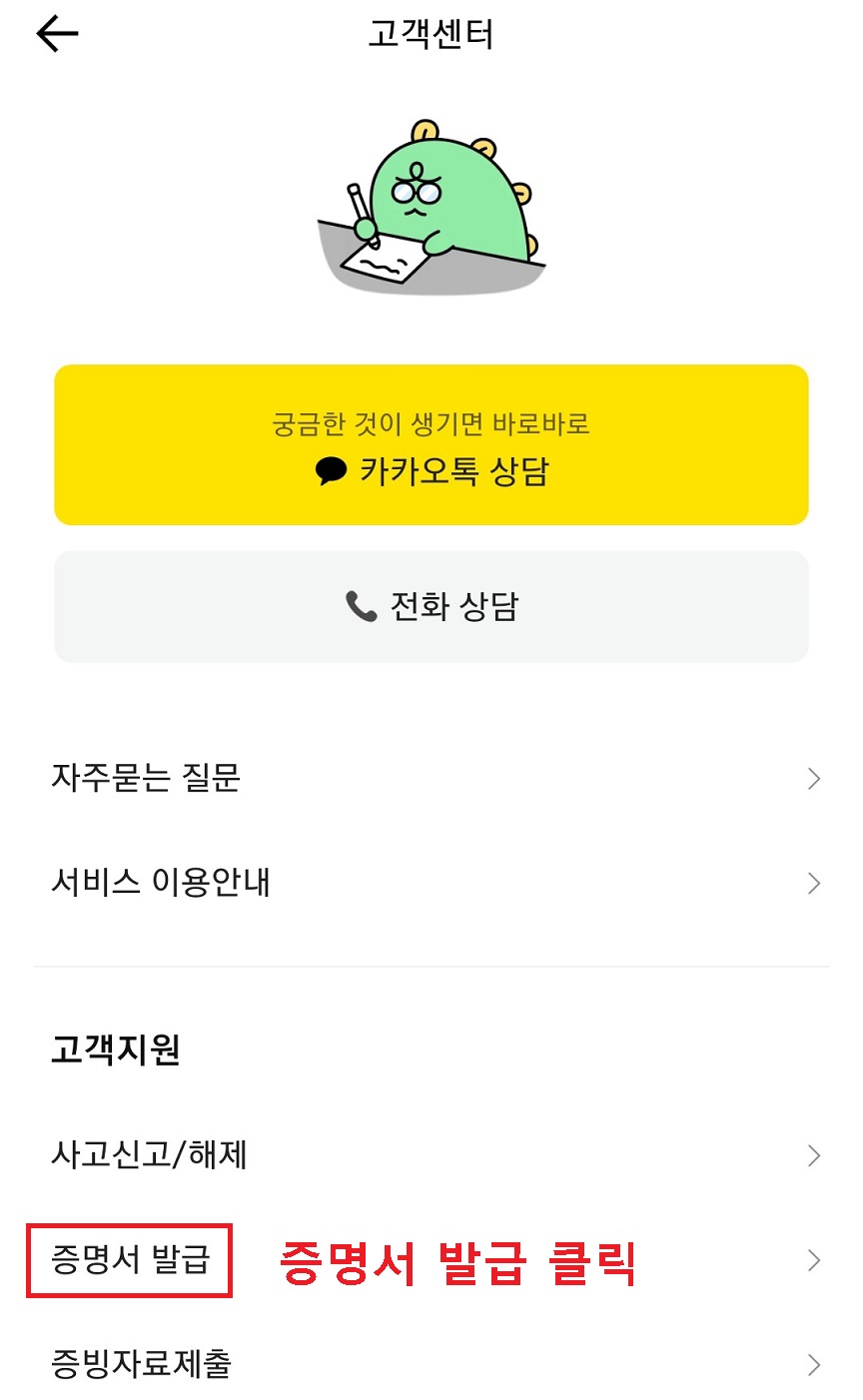 3. 그럼 고객센터 화면으로 이동하는데 여기서 증명서 발급을 클릭한다.