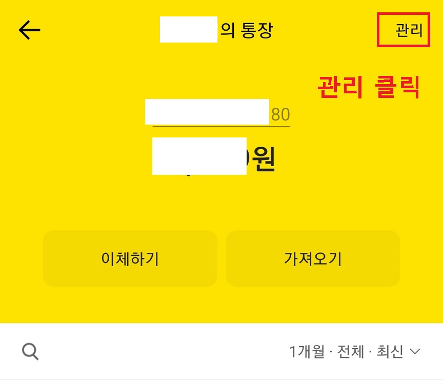 2. 그럼 카카오뱅크 통장의 우측 상단에 관리 버튼이 생기는데 클릭한다.