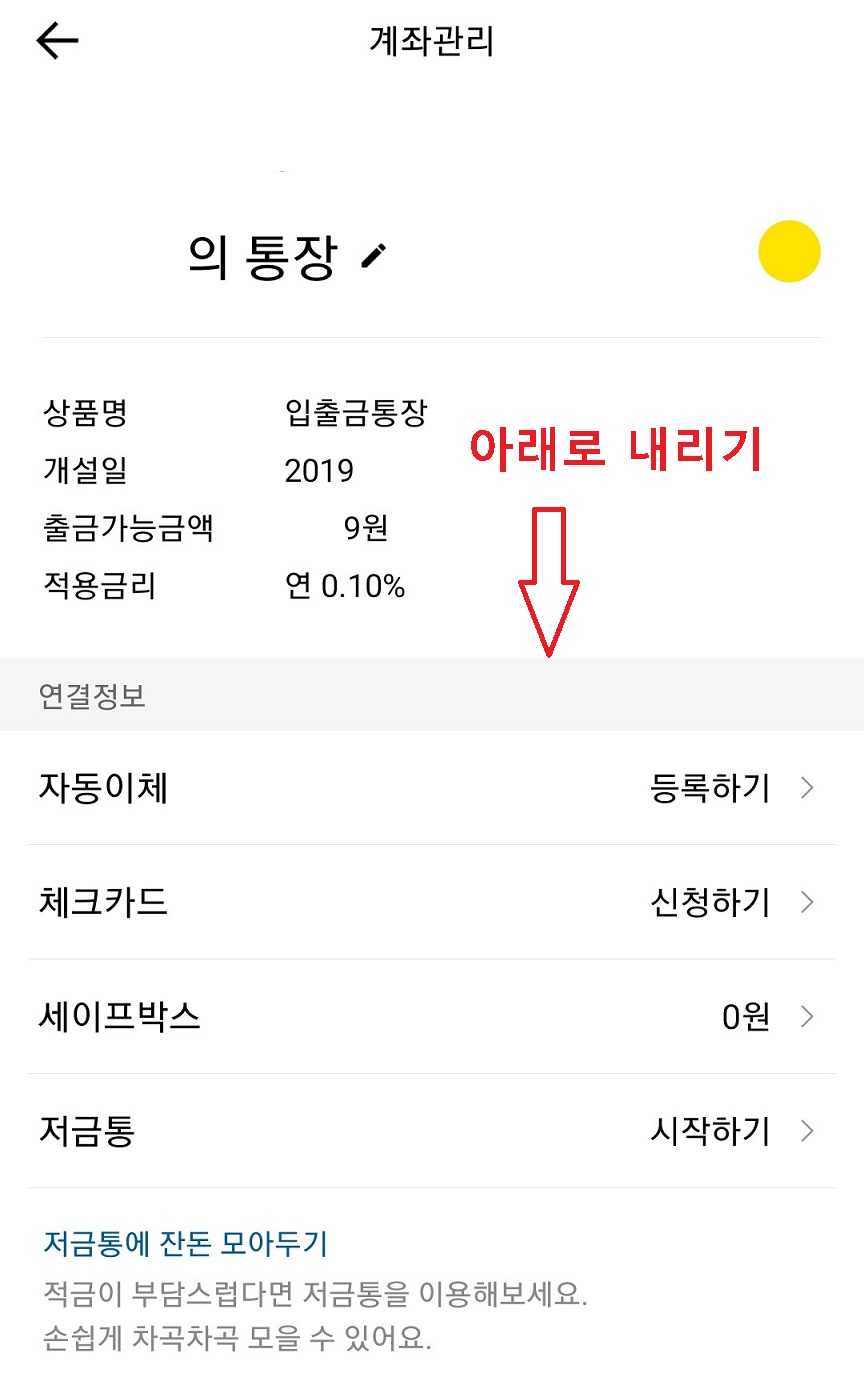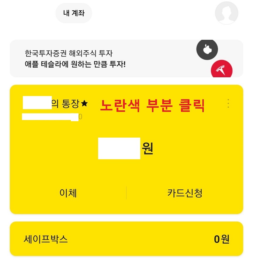 1. 카카오뱅크 앱에 들어가서 통장의 노란색 부분을 클릭한다.