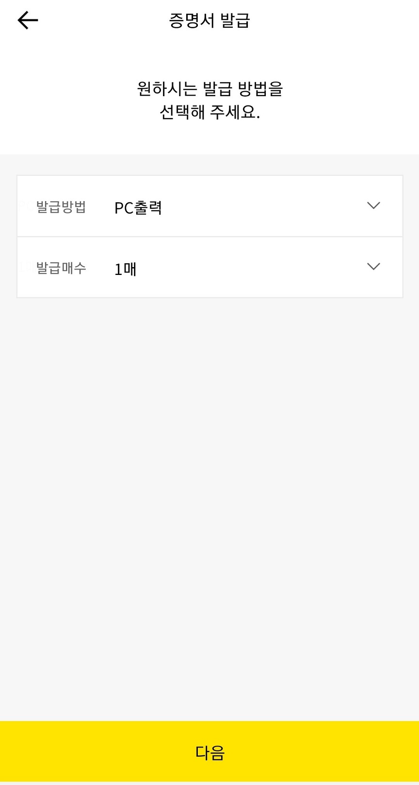 8. PC 출력을 선택하면 발급매수도 선택 해야 한다.