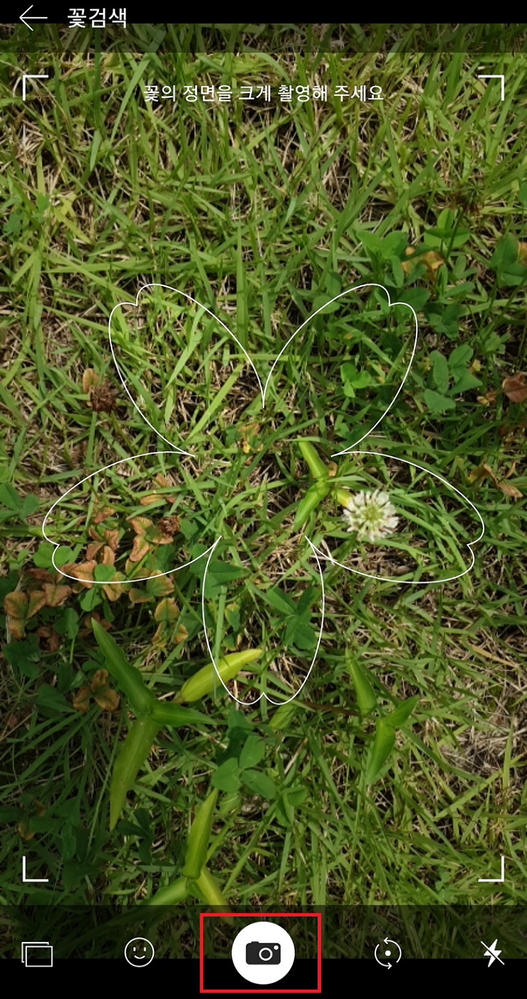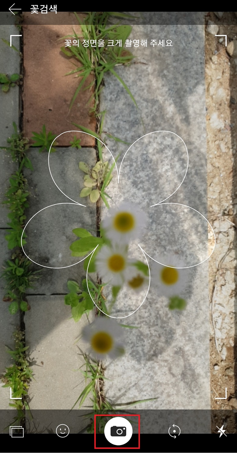화면 중간에 꽃모양의 흰색 라인이 보이는데 여기에 맞춘 후 하단 카메라 촬영 버튼을 누른다.