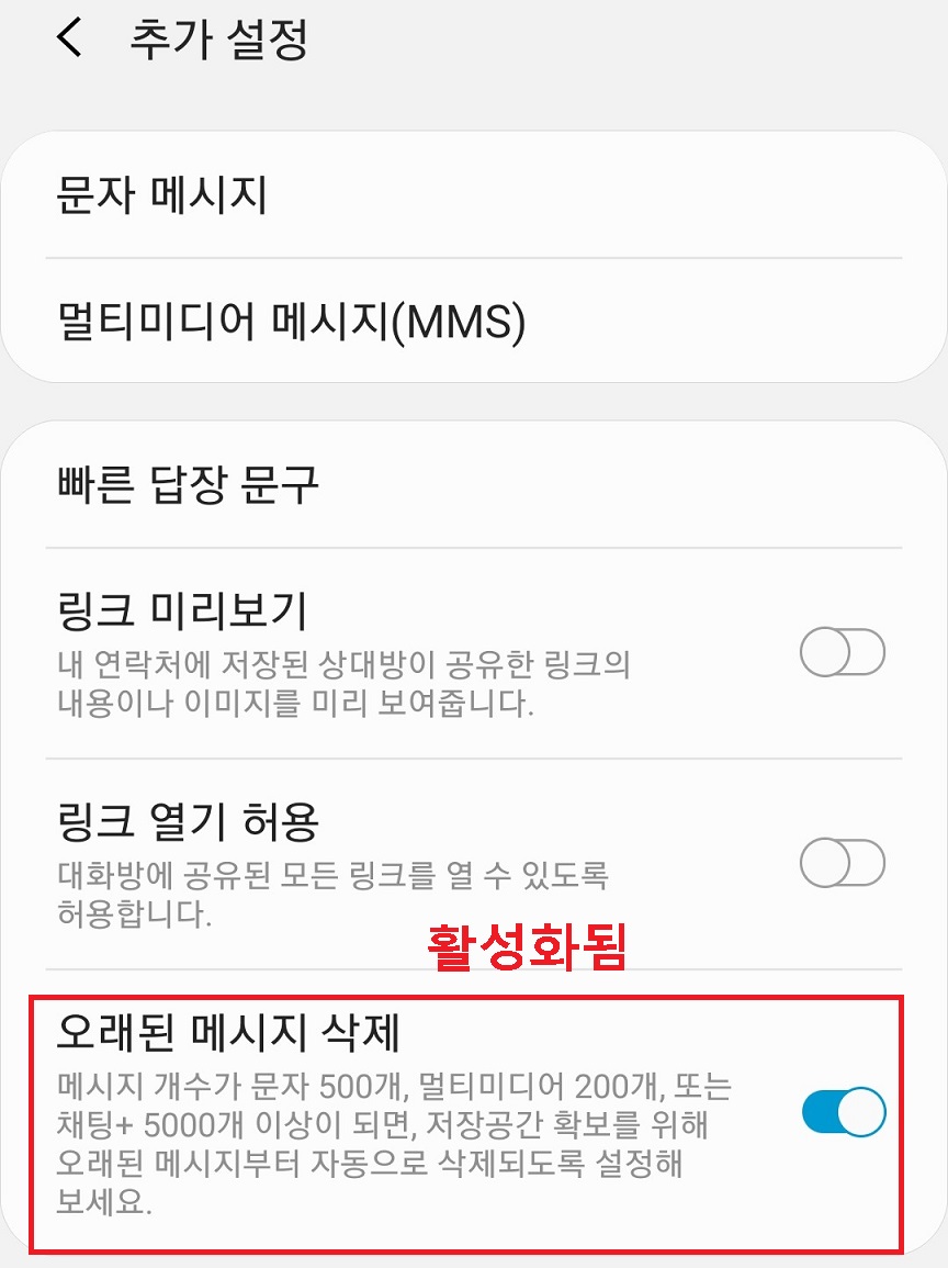 5. 이제 핸드폰 오래된 문자메시지 삭제 기능이 활성화되었다.