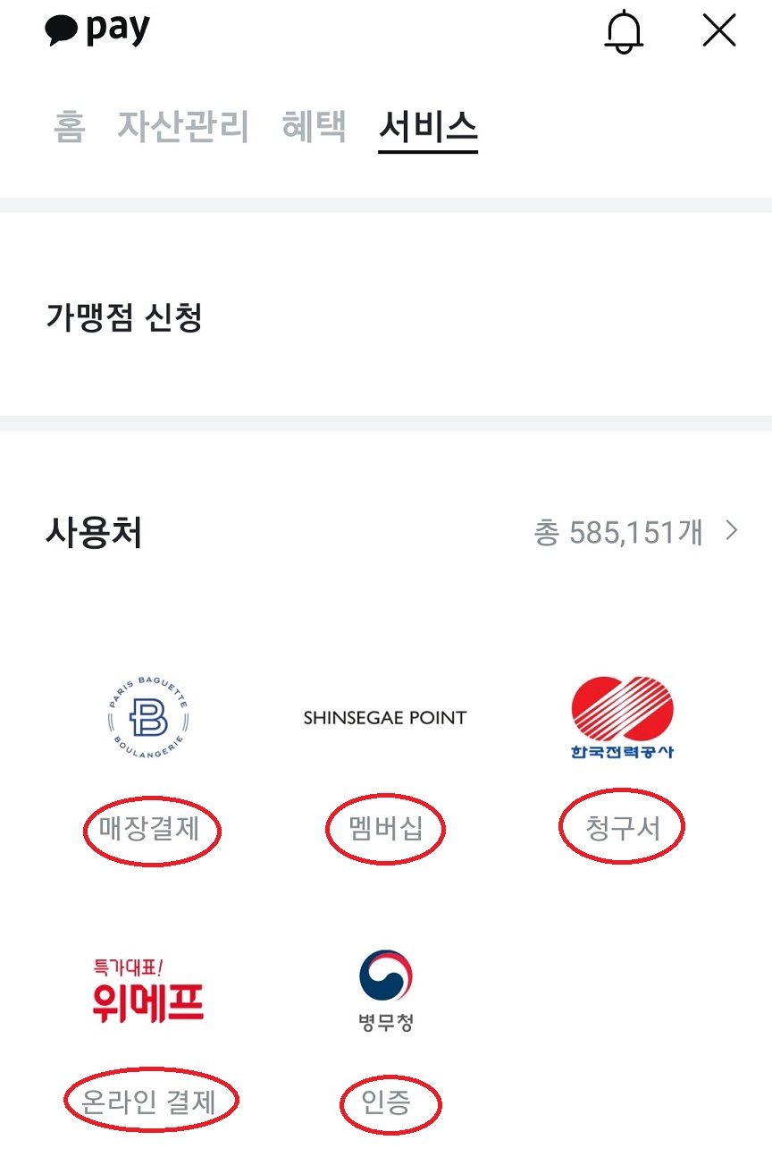 4. 사용처 글자 아래에 매장 결제, 멤버십, 청구서, 온라인 결제, 인증 5개 카테고리로 나뉘어 있는 것을 확인할 수 있다.