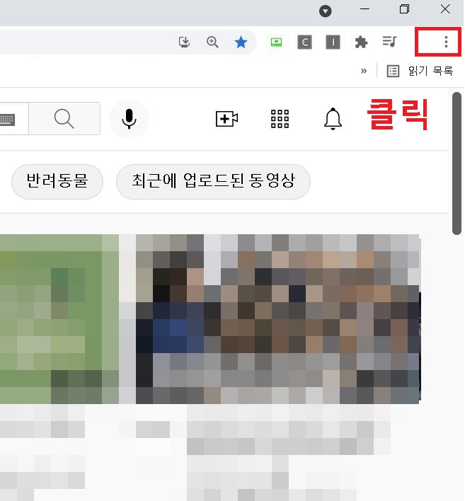 1. 크롬에서 먼저 유튜브를 실행시킨 후 오른쪽 상단에 점 3개 모양의 아이콘을 클릭한다.