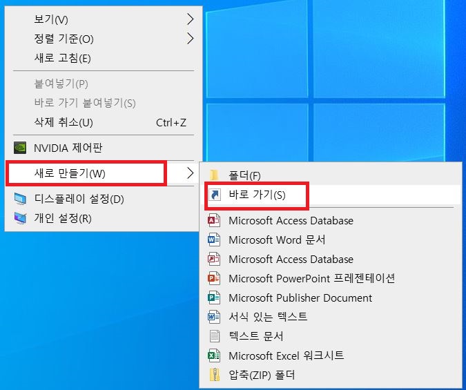 1. 윈도우 10 바탕화면에서 마우스 오른쪽 버튼을 누른 후 새로 만들기 → 바로가기를 클릭한다.