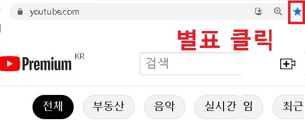 1. 크롬 브라우저로 유튜브 접속 후 주소창 오른쪽 별표를 클릭한다.