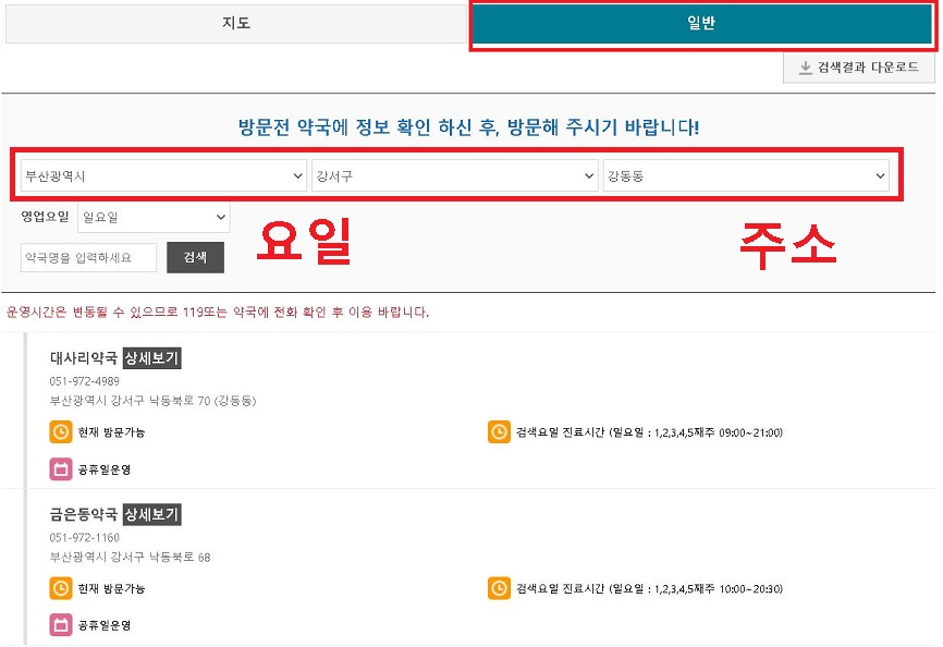 나는 부산광역시 강서구 강동동에 일요일 문 여는곳 약국을 검색해보았다.