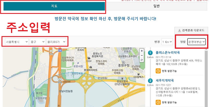 13. 지도 탭이 먼저 뜨는데 위 병원 찾기에서 했던 것과 동일하게 주소 입력 후 정렬을 운영 여부 순으로 하면 된다.