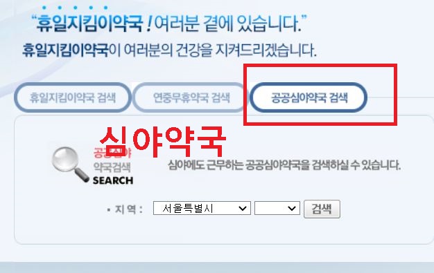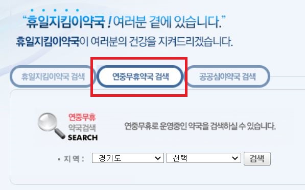 약국의 경우 휴일지킴이 약국이라는 사이트를 통해서도 공휴일 및 일요일 문 여는 약국을 찾을 수 있다.