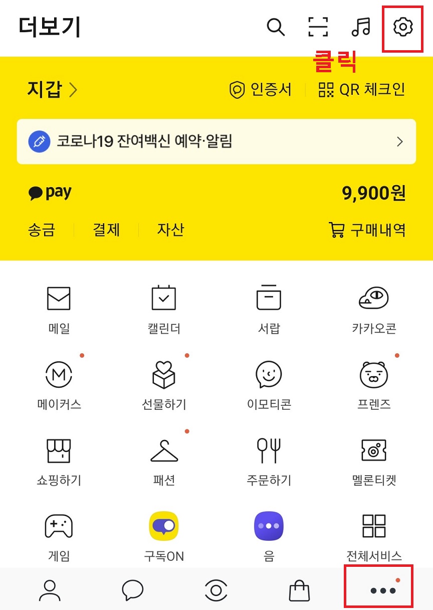 1. 카카오톡 더보기 페이지에서 우측 오른쪽 톱니바퀴 모양을 클릭한다.