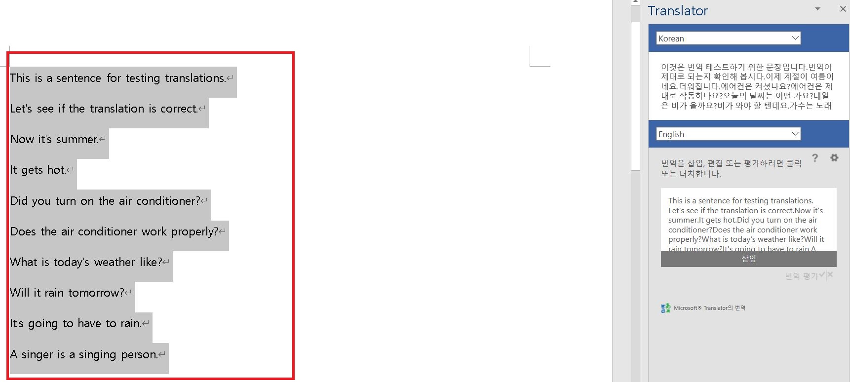 7) 마우스 커서를 아래 번역하려는 영어 쪽으로 옮겨서 클릭하면 없던 삽입 버튼이 나타난다.