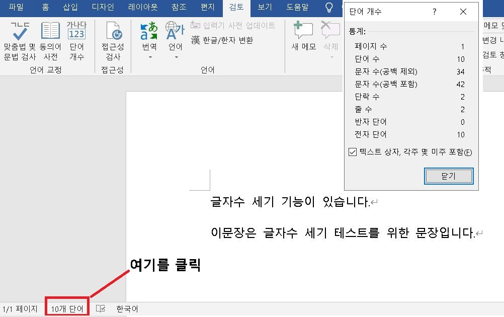 1) 검토 탭에서 단어 개수를 클릭한다.