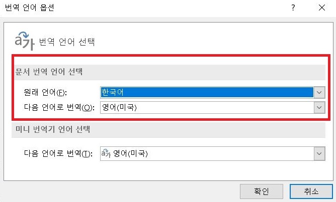 3) 문서 번역 언어 선택에서 해당 언어를 고르고 확인 버튼을 누른다.