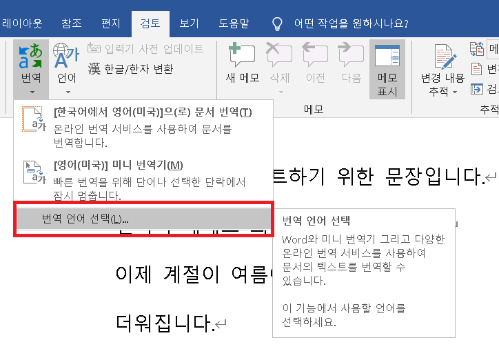 문서 작성하다보면 가끔 번역이 필요한 경우가 있는데 MS WORD 자체에서 해결하면 편리하다.