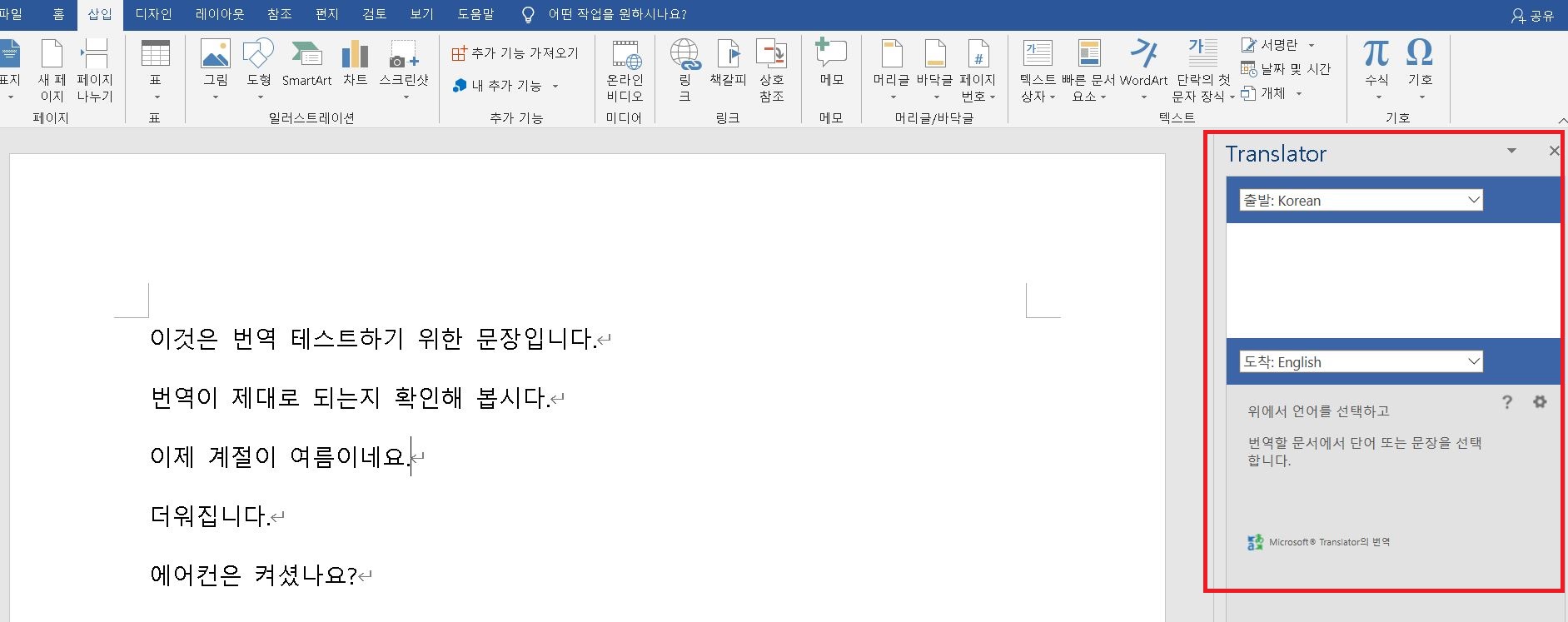 5) MS워드 오른쪽에 Translator 란이 새로 생긴다.