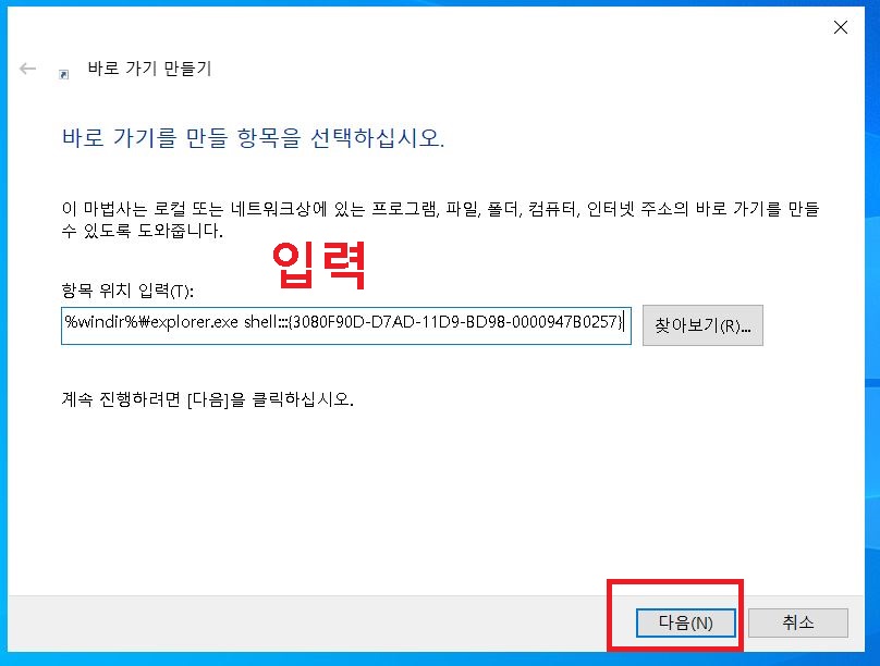 3. 그럼 바로가기 만들기 창이 나타나는데 이건 항목 위치 입력에 사진과 같이 이동위치를 입력한다.