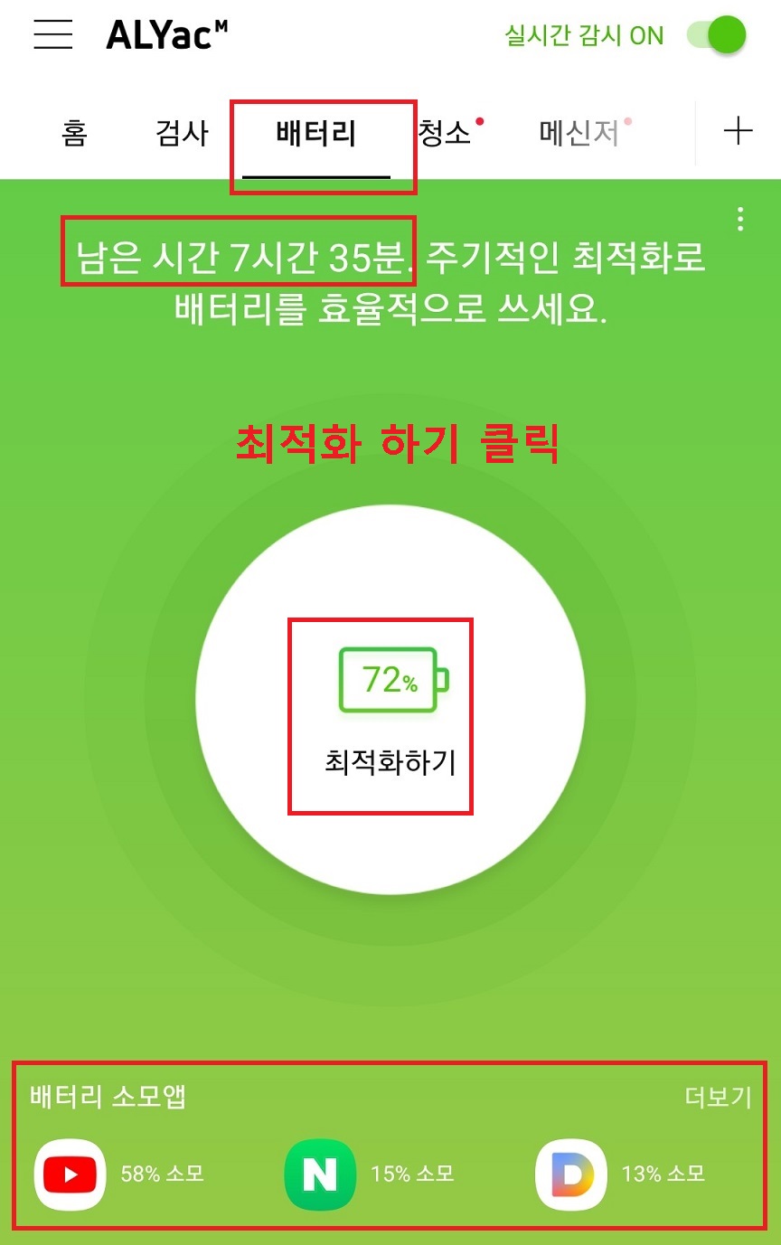 2. 알약이 실행되면 배터리 탭으로 이동해서 최적화하기를 클릭한다.