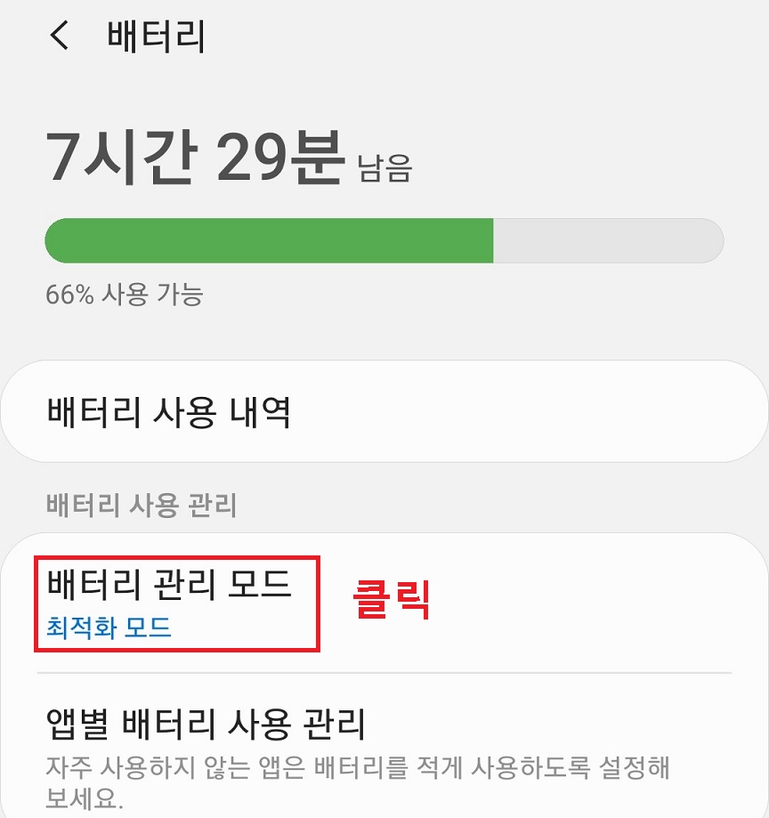 배터리 관리모드에서 절전모드로 설정해서 핸드폰 배터리 절약을 할 수 있다.